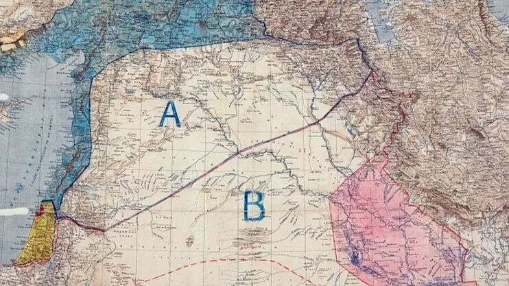 Karta Sykes-Picotovog sporazuma koja prikazuje istočnu Tursku, Siriju i zapadnu Perziju, te područja kontrole i utjecaja dogovorena između Britanaca i Francuza. Kraljevsko geografsko društvo, 1910.-15. godine. Sporazum su potpisali Mark Sykes i François Georges-Picot, 08. svibnja 1916. godine