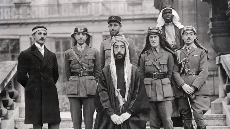 Versajska konferencija 1919. godine. Slijeva na desno: Rustum Haidar, Nuri as-Said, princ Faisal (sprijeda), kapetan Pisani (straga), T. E. Lawrence i kapetan Hassan Khadri.