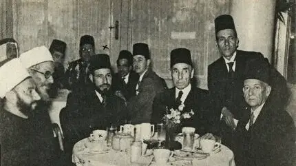 Al-Banna (treći slijeva), Aziz Ali al-Misri (četvrti sa desna), Mohamed Ali Eltaher (drugi sa desna), uz ostale egipatske, palestinske i alžirske političke i vjerske predvodnike, na prijemu u Kairu (1947.)
