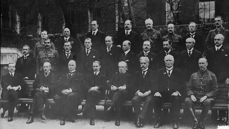 Britanski ratni kabinet. Sjede u prvom redu, slijeva nadesno: neidentificirani, Alfred Milner, George Curzon; prvi markiz Curzon; Bonar Law, David Lloyd George, Robert Burden, William Massey, Jan Smuts.