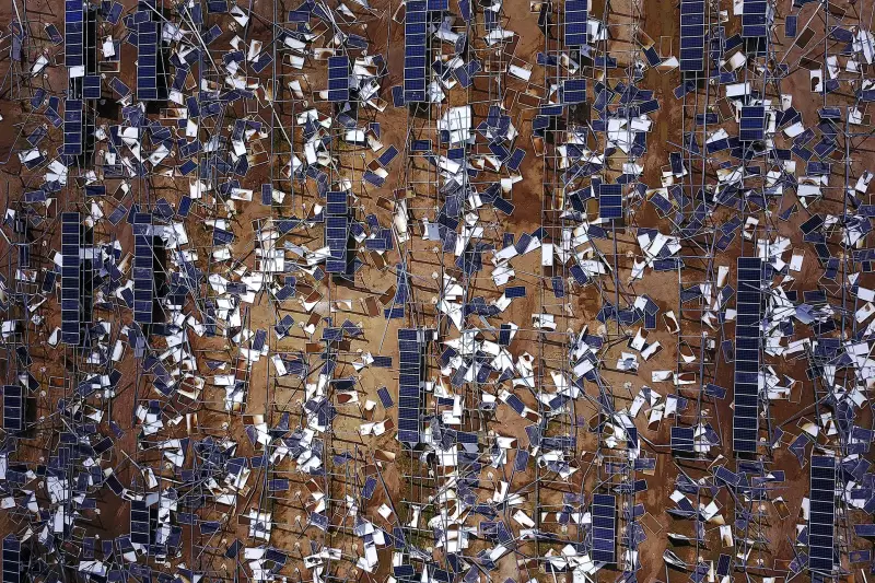 Krhotine solarnih panela vide se razbacane na solarnoj farmi nakon uragana Maria u Humacau, Portoriko, 2. listopada 2017.
