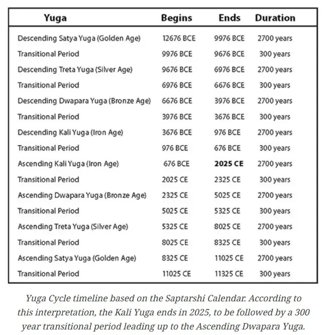 Yuga ciklus izmjenjuje silaznu i uzlaznu fazu. Prema vremenskoj liniji izvedenoj iz ciklusa Saptarshi, Kali Yuga je započela 3676. godine prije Krista i trebala bi završiti 2025. godine. Nakon toga, prijelazno razdoblje od 300 godina dovest će do Uzlazne Dwapara Yuge, koja će se u potpunosti manifestirati do 2325. godine. Ovo razdoblje će naslijediti Uzlazna Treta Yuga i Uzlazna Satya Yuga, dovršavajući ciklus uspona od 12 000 godina.