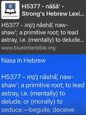Jezik ponekad nudi neočekivane uvide. Dok sam tražio etimologiju i značenja u jezicima, otkrio sam kako hebrejska riječ "nasa" (נָשָׂא, prema: Strongov hebrejski, 5377.) znači "prevariti" ili "navesti na krivi put". Potpuna definicija iz Strongovog Hebrejskog leksikona glasi: "primitivni korijen; odvesti na krivi put, tj. (mentalno) zavesti, ili (moralno) zavesti: prevariti, prevariti." Netko bi ovo mogao odbaciti kao slučajnost, ali je jezična paralela zapanjujuća.