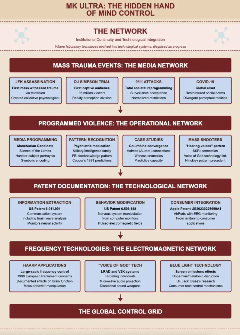 "Prije nego što su algoritmi preuzeli utjecaj na naše misli, masovni traumatski događaji služili su kao 'prekidači obrazaca', na razini cijelog društva - stvarajući pritom iste vrste disocijativnih stanja (u cijelim populacijama) koje je MKULTRA pokušala izazvati kod pojedinačnih subjekata."