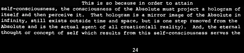 To je zato što, kako bi postigla samosvijest, svijest Apsoluta mora projicirati hologram sebe, a zatim ga percipirati. Taj hologram je zrcalna slika Apsoluta u beskonačnosti, još uvijek postoji izvan prostora i vremena, ali je udaljen jedan korak od Apsoluta i stvarni je pokretač sveg stvaranja (sve stvarnosti). I vječna misao, ili koncept sebe, koji proizlazi iz ove samosvijesti služi....