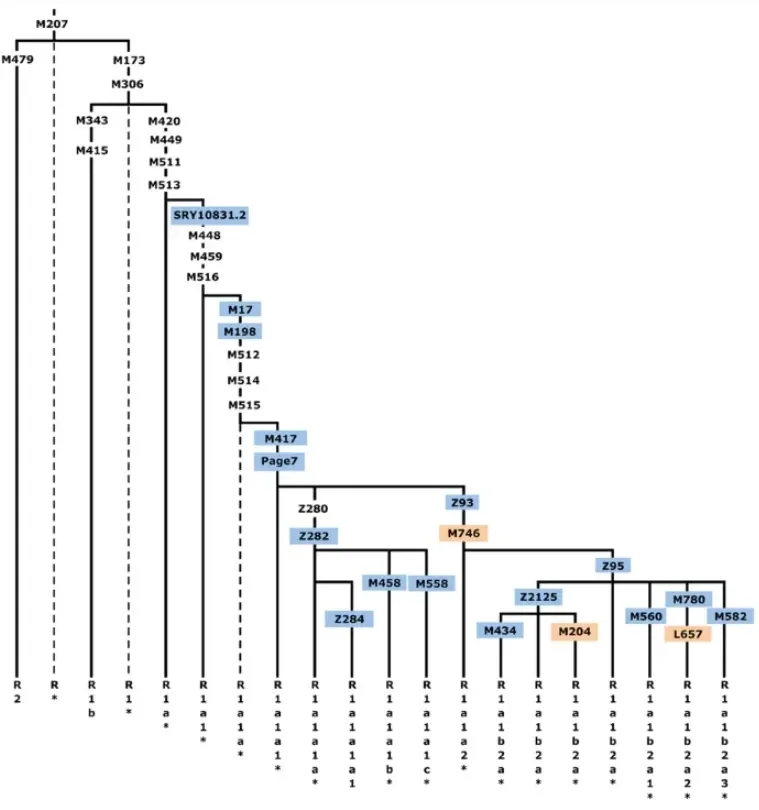 Gore je slika koja definira grane Y-kromosomske haplogrupe R koje se razlikuju po brojnim mutacijama, a koje su se akumulirale tijekom desetaka tisuća godina (najbolja procjena jest kako su se R1 i R2 razdvojili prije oko 35000 do 40000 godina). Iako postoje različite nomenklature za Y i mtDNA haplogrupe, ovaj zajednički sustav je prilično jednostavan, u načinu na koji se imena prate uz mutacijame. Prvo, dvije mutacije, M479 i M173, definiraju razdvajanje između R1 i R2. Zatim, unutar R1 vidite mutacije koje definiraju R1b i R1a; i slijedeće unutar R1a vidite mutaciju M17, koja definira R1a1a. Pproces ide dalje unutar R1a u ovom stablu, a neki genealoški fanatici definiraju jedinstvene mutacije, koje prate bliske grane iste obitelji.