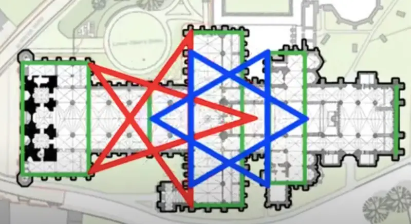 (Napomena moja: Katedrala u Chartresu, koju zaista dulje vrijeme proučavam, ima tlocrt poput ovoga gore desno - točnije: centralni dio katedrale ima sve elemente ocrtane u krugu. Ono što sam vremenom zaključila, odnosno jedino logično iz svega toga: postoje katedrale i "katedrale"; postoji gotika i "gotika"; postoje graditelji i "graditelji". Zmija je bitna i u Chartesu, no ne želim kvariti Rurikovu seriju, jer je redom odličan uvod za ostalo što ću vam ispisati na ovoj stranici, ako bude sve ok)