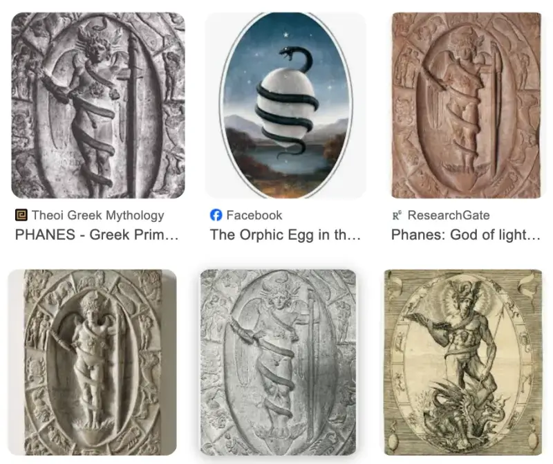 Kozmičko jaje je omfalos, ranije spomenuto. Fanes se rađa iz omfala, kozmičkog jajeta. Međutim, u kasnijim verzijama priče, omfalos postaje kamen koji je Kronos slučajno progutao umjesto Zeusa, i tako je omogućio Zeusu da se rodi, umjesto da ga Kronos proguta, poput njegove druge olimpijske braće i sestara. Što je još gore, ne znamo je li se prije pojavila priča o Fanesu iz orfičkih misterijskih kultova, ili Hesiodova mainstream "Teogonija". Kultisti Zeusa su kasnije tvrdili da je Zeus progutao Fanesa zato da potvrdi svoju dominaciju i preuzme svoje kozmičko kraljevstvo, što još više zbunjuje stvar, jer se Zeus odjednom ponaša baš kao što je to učinio Kronos.