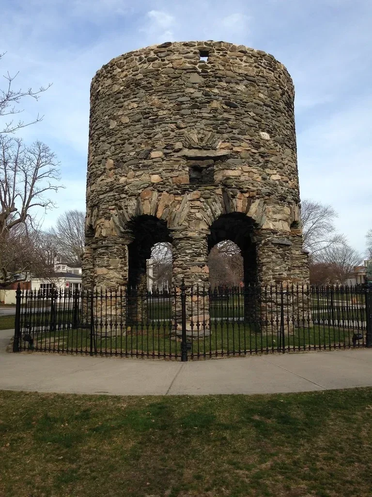 U srcu Newporta, u ulici Farewell, poput odlazećeg opscenog gesta, prsta upućenog akademskoj zajednici, nalazi se Newport Tower. Verrazano je toranj zabilježio kao normansku vilu još 1527. godine, na kartama koje bilježe njegovo istraživanje obale Nove Engleske. Također, prikazana je na velikoj svjetskoj karti Gerardusa Mercatora, iz 1569. godine. "Znanstvenici" godinama tvrde kako je Toranj izgradio Benedict Arnold I., po uzoru na vjetrenjaču iz Chestertona, Engleska, "njegova rodnog grada". Tijekom godina je bilo brojnih pokušaja kako bi se utvrdila stvarna starost tornja. Prilagođeni datumi datiranja ugljikom morta, kao i iskapanja oko njega, ukazuju na to da su na njemu radovi obavljeni u 16. stoljeću, ali očitanja bliže temeljima ukazuju na datum njegove stvarne izgradnje u 13. stoljeću. Činjenica jest: engleski registar pokazuje da je obitelj Arnold živjela stotinu milja od vjetrenjače Chesterton, te je izgrađena gotovo u vrijeme odlaska obitelji Arnold u Ameriku. Krajnje je malo vjerojatno da je vjetrenjaču Arnold ikada vidio. Osim po svojim proporcijama i cilindričnoj simetriji, dvije strukture malo sliče jedna drugoj. Prozori Newport Towersa su naizgled nepravilno raspoređeni kvadrati, dok su prozori na vjetrenjačama pravilno raspoređeni jednolični pravokutnici. Vjetrenjača ima šest lukova koje podupire šest stupova; dok Toranj ima osam lukova koje podupire osam stupova, u skladu sa tradicionalnom templarskom metodom izgradnje crkava.