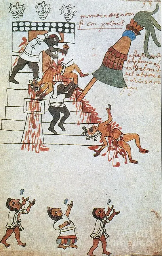 "Toga dana... prinijeli su brojne žrtve krvi uzete i iz ušiju i sa jezika... Osim ovih i drugih žrtava i ceremonija, prinijeli su i mnoga ljudska bića... nesretne žrtve su rastezali na leđa prilikom žrtvovanja. Prsa su im bila vrlo bolna, jer su im bile vezane i noge i ruke... Krvnik bi se brzo približio s kremenom... velikom silom bi otvorili nesretnu žrtvu i odmah bi mu iščupali srce... Povremeno bi stariji svećenici hrama proždirali srca, ili ih zakopali. Nakon toga bi uzeli tijelo žrtve i bacili ga niz stepenice. U slučaju da je žrtva bila ratni zarobljenik, njegov bi ga otmičar sa prijateljima i rodbinom odnosio, kada bi stiglo do dna i, pripremajući to ljudsko meso sa drugom hranom, priredili bi gozbu drugog dana i konzumirali ga." "Istog dana dogodila se još jedna, još veća i nikada čuvena okrutnost. Na vrh onih šest stupova koje su podigli uoči blagdana, svezali su i razapeli šest muških ratnih zarobljenika. Dolje je bilo više od dvije tisuće dječaka i muškaraca sa lukovima i strijelama. Nakon što su oni koji su otišli svezati zarobljenike sišli, dječaci i muškarci ispalili su strijele, poput kiše, na šest razapetih zarobljenika. Ubrzo su se popeli, odvezali polumrtve žrtve i pustili ih neka padnu s te visine. Takav je to bio tresak kojim su udarili o tlo da im je svaka kost u tijelu bila slomljena ili izubijana. Nakon toga su ih Indijanci podvrgli trećoj smrti, žrtvujući ih i iščupavši im srca. Na kraju su ih odvukli, prerezali im grkljan, odsjekli glavu i dali glave svećeniku idola, dok su tijela, poput ovčetine, nosili gospodarima i poglavarima za hranu…..."
