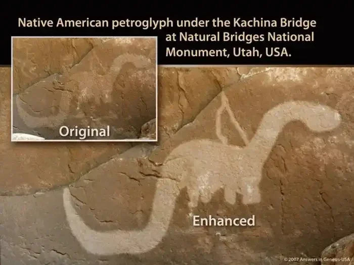 Most Kachina ukrašen je izblijedjelim glifom, koji izgleda kao sauropodski dinosaur, na oduševljenje kreacionista i razočaranje šarlatana Smithsoniana, koji su pokrenuli internetski hor koji uglas šmrca kako je to samo mrlja od blata.