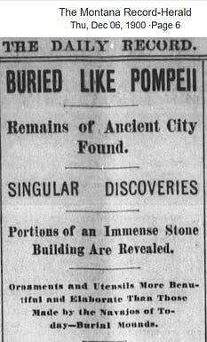 Godine 1900., The Montana Record-Herald je objavio članak: "Pokopani poput Pompeja. Pronađeni ostaci drevnog grada. Otkriveni su dijelovi goleme kamene građevine. Ukrasi i pribor ljepši i razrađeniji od onih koje bi danas izradili Navajosi. Grobni humci.":