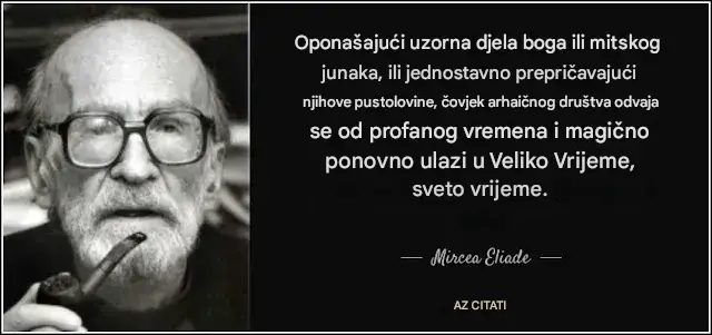 Nitko nije bio, niti će ikada biti, utjecajniji od Mircee Eliadea, čak niti hvaljeni Joseph Campbell. Ali, današnja akademska zajednica, sa svojom sklonošću semantici i rezanju cjeline na sve manje i manje dijelove, dok uopće ne ostane ništa za vidjeti (Pribram i Bohm su svijet upozorili na ovaj problem), i dalje se buni protiv njega. Kažu da je Eliade sve kulture naslikao preširokim potezom kista i čini se kao da oni smatraju da su njihove iznimke važnije od njegove cjeline. Ista greška koju je napravio i Einstein.