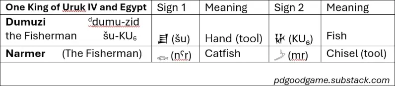 Tvrdnja je nadalje: Dumuzi i Narmer su različita imena za istu osobu. Kada je ovaj kralj ubijen (oko 3100. pr. Kr.), i Uručko Carstvo i Egipatsko Kraljevstvo su se srušili, i upali u kaos.