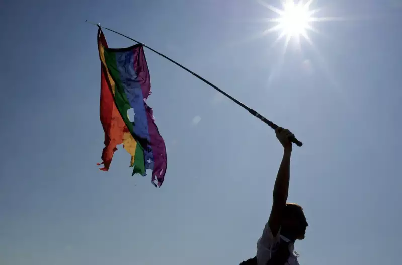 Osoba maše oštećenom zastavom duginih boja tijekom gay pridea u St. Petersburgu, Rusija, 26. srpnja 2014. godine.