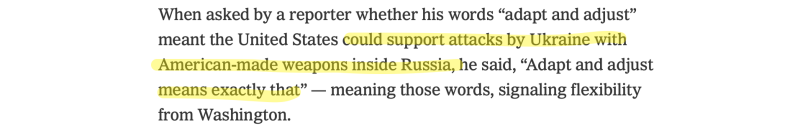 U tekstualnom, ali besmislenom dodatnom članku sinoć, Times je objavio još jednu oštroumnu priču pod naslovom: Od saveznika i savjetnika raste pritisak na Bidena neka dopusti napade na ruski teritorij. Podnaslov objašnjava te ultravisoke uloge: “Predsjednik Biden odvaguje strahove od eskalacije s nuklearno naoružanim protivnikom, dok razmatra hoće li dopustiti Ukrajini da gađa Rusiju američkim oružjem.”
