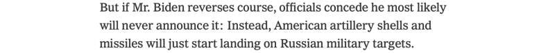 Grozni, strašni, loši New York Times nije uspio citirati niti jedan odgovor Rusa, ni u jednom članku, o predloženoj promjeni politike SAD-a, iako promjena označava povijesni trenutak - prvi put u povijesti je nuklearna supersila ovlastila opunomoćenika i isporučila oružje s kojim se mogloo izravno napasti drugu nuklearnu supersilu. To bi bilo kao da Rusija daje Kubi taktičke projektile dugog dometa (koji mogu nositi nuklearne bombe!), i daje svu telemetriju i smjernice, kako pogoditi Bijelu kuću.