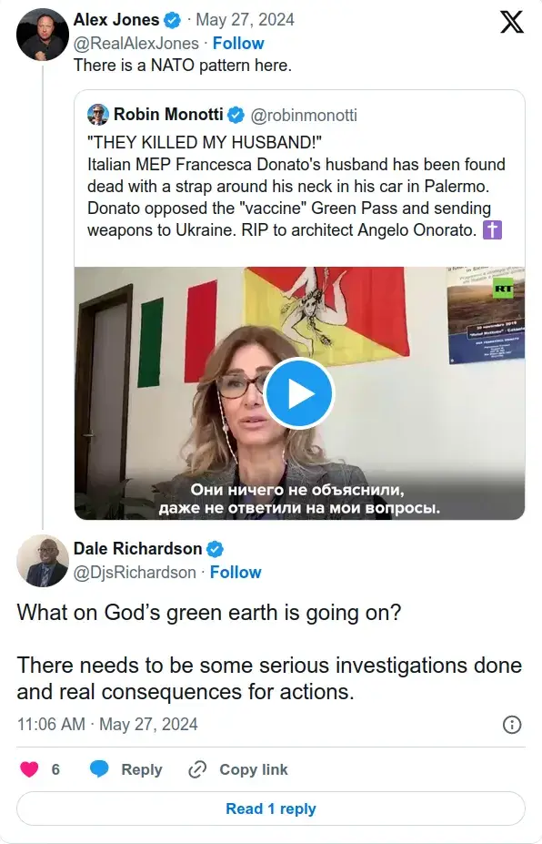 Donato sada diže uzbunu, tvrdi kako joj je muž ubijen, jer se suprotstavljao globalističkoj agendi WEF-a.