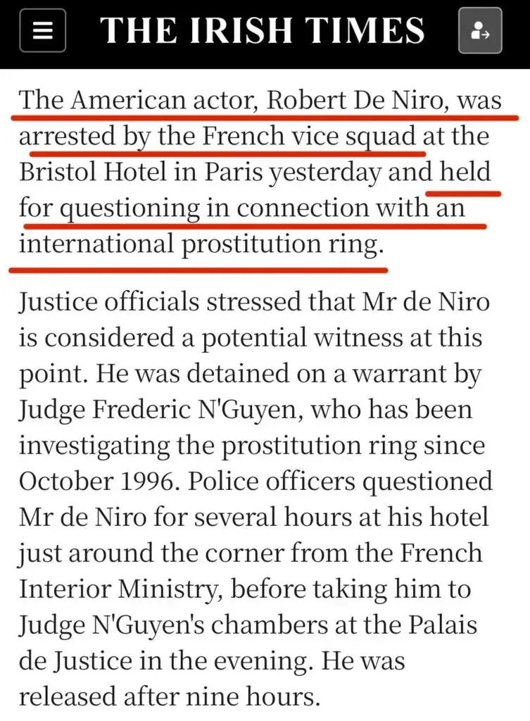 Razotkrivanje torture i ubojstava djece jest razlog zašto se čelnici KM doslovno bore za svoje živote. Robert de Niro je primjer za to. “Užasno se boji onoga što dolazi za njega i njegove prijatelje pedofile”, kaže izvor iz CIA-e. Prema BBC-ju, De Nira su 1998. godine pritvorile i ispitale francuske vlasti, nakon što je pronađen u “maloj crnoj knjižici” i popisu kupaca Jean-Pierrea Bourgeoisa, vođe međunarodne operacije trgovine ljudima/djecom. Slučaj je otkrio brutalne metode korištene da se uhvate u zamku mlade žene, od kojih su neke imale samo 15 godina. De Niro je priznao kako je bludničio sa ženama s kojima ga je Bourgeois upoznao.