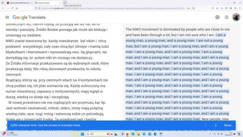 Kad sam unio ove poljske informacije u Google Translate, sve što se vratilo bilo je ponavljanje "Ja sam znanstvenik, ja sam znanstvenik", odnosno "Ja sam mladić, ja sam mladić".