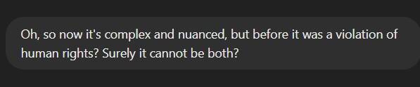 Često trolam UI (LLM) iz zabave, u svoje slobodno vrijeme, da vidim koliko su ih politički programirali za određena pitanja, te da procijenim da li su indoktrinirani na isti način kao i njihovi temeljito uvjetovani neomarksistički inženjeri u Silicijskoj dolini, koji će ih naoružati neka isperu mozak budućim generacijama - na isti onaj način na koji je Googleov zatvor, obrnutog panoptikuma, konstruiran za Milenijalce i Zoomere.