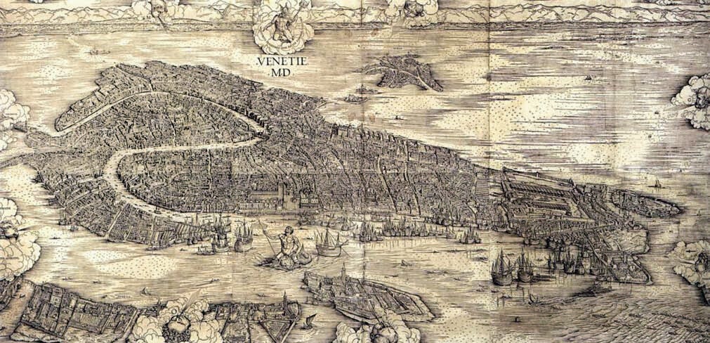 Venecija, grad izgrađen na otocima u lagunama i močvarama sjevernog Jadrana, za koji se pretpostavlja kako su ga osnovali izbjeglice s talijanskog kopna koji su bježali od Huna Atile, oko 452. godine. Venecija je rano postala sjedištem benediktinaca, u