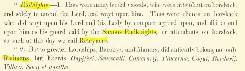U raznim arhivskim spisima oni se nazivaju: Radknights, Rodknights (Bractonov tekst), Riding knights, Riding narednici, Radman, Radechenistre, Radchenistres, Radmanni, thegns, the drengs, Radcnicts, Reteyners i Geneats.