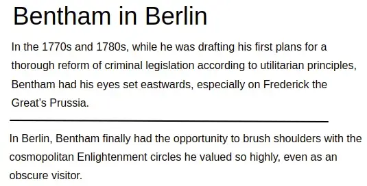 Kada pogledamo u filozofiju Jeremyja Benthama, vidimo kako je on jednostavno proizvod svog vremena - prosvjetiteljstva i masonerije. Ne samo da je zadržao epikurejski pogled na svijet, već je rezonirao sa svjetonazorom svog intelektualnog idola, Fridrika Velikog. U Berlinu je Bentham bio mala riba, u vrlo velikoj prosvijećenoj bari, te je učinio sve kako bi ugodio svom masonskom gospodaru Fredericku. Možda su tu Benthamovi štićenici razvili patološku mržnju prema Rusiji. Ali, to nije imalo nikakve veze sa zaštitom britanskih interesa, već s oslobođanjem Fridrika istočne kriške Velikog pruskog sendviča.