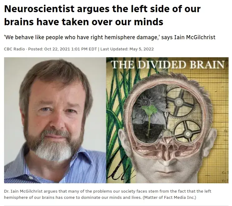 Iain McGhilchrist daje kritični dio slagalice današnjeg probuđenog društva. Njegova briljantna knjiga, "Gospodar i njegov izaslanik", istražuje kako je lijeva strana mozga zarobila desnu. Ovaj dvominutni video sažima njegovu knjigu: