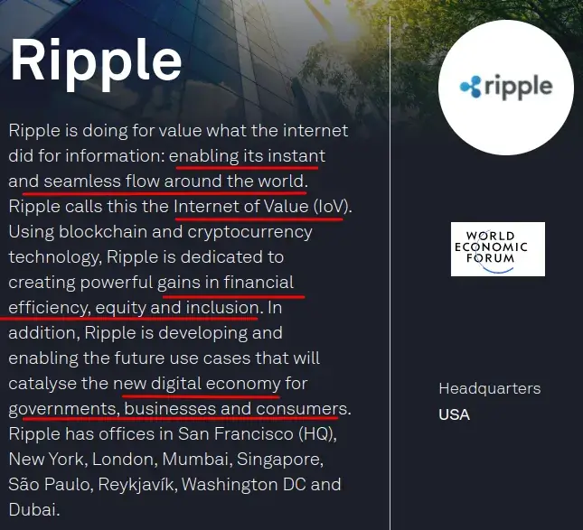 ReichsWEF vjeruje da će Ripple zamijeniti funkciju USD. I ne samo to, svaka će se transakcija diljem svijeta bilježiti korištenjem blockchain tehnologije. Stoga se transakcijski obrazac života pojedinca može pomno analizirati kako bi se osiguralo da su obrasci zarade, potrošnje i ulaganja unutar UN-ovih smjernica o raznolikosti, pravednosti i uključenosti.