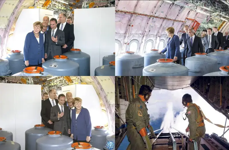 Angela Merkel oko 2008. godine u obilasku preuređenog zrakoplova američkih zračnih snaga, uzbuđena što sudjeluje u trovanju ljudi Europe. Možete uzeti DDR iz Njemačke, ali ne možete ukloniti komunistički ubojiti instinkt iz "socijalista" u Europi. Svaka optužba za "ubijanje plinom!" je ispovijed.