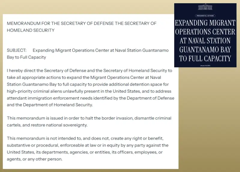 "Ovim putem upućujem ministra obrane (Pete Hegseth) i ministricu domovinske sigurnosti (Kristi Noem) da poduzmu sve odgovarajuće radnje kako bi proširili Migrantski operativni centar u mornaričkoj postaji Guantanamo Bay do punog kapaciteta, te kako bi osigurali dodatni pritvorski prostor za visokoprioritetne kriminalne strance koji su nezakonito prisutni u Sjedinjenim Državama i kako bi se pozabavili pratećim imigracijskim potrebama, koje zajednički identificiraju Ministarstvo obrane i Ministarstvo domovinske sigurnosti.