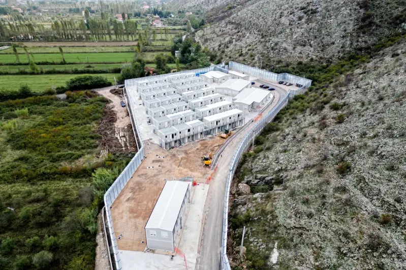 Novoizgrađeni centar za migrante kojim upravlja Italija u luci Shengjin, Albanija, 11. listopada 2024. Plan za preusmjeravanje pristiglih morem u "središte za povratak" izvan EU-a u Albaniji tri su puta blokirali sudovi. Italija je naposljetku zaobišla zabranu suda EU-a dodavši Albaniju na svoj popis sigurnih trećih zemalja i rebrendirajući centre u "centre za repatrijaciju".