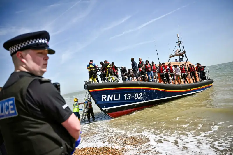 Britanski policajac čuva stražu na plaži dok osoblje Royal National Lifeboat Institution pomaže migrantima pri iskrcavanju iz čamca za spašavanje, nakon što su spašeni dok su pokušavali prijeći La Manche u Dungenessu, Engleska, 15. lipnja 2022. godine.