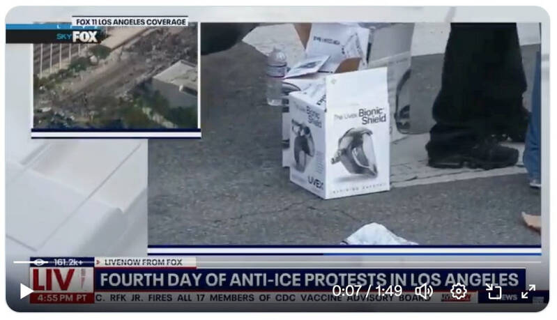 Televizijske kamere snimile su kutije s "bioničkim štitovima" koje su se u ponedjeljak dijelile prosvjednicima u Los Angelesu. Snimka mjesta događaja prikazuje kutije s čvrstim maskama za cijelo lice - gotovo sličnim kacigama - koje su dvije žene dijelile iz stražnjeg dijela kamioneta dok je maskirani vozač čekao da istovare robu. Snimka je izazvala zabrinutost kod nekih da vanjski agitatori olakšavaju nerede opremajući mase za potencijalne sukobe s policijom ili Nacionalnom gardom. Međutim, drugi kažu da su maske sigurnosna oprema, nošena kao mjera opreza nakon što su prosvjednici ozlijeđeni gumenim mecima koje su vlasti ispalile.
