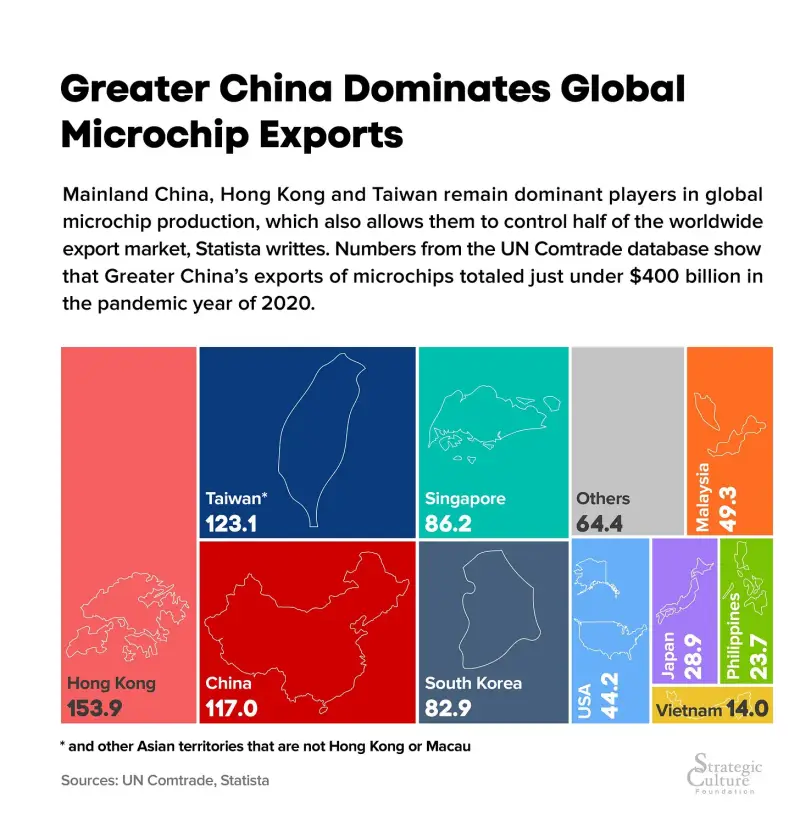 TSMC (Tajvan) i Samsung (Južna Koreja) su trenutno glavni titani u najsuvremenijoj industriji poluvodiča (tj. 7nm i 5nm čipova), međutim, kineski je SMIC bio najveći dobavljač 20nm+ čipova, koji su bitni za potrošačko tržište. Kada je Kina uklonjena s ovog tržišta, stvorilo se usko grlo, jer su TSMC i Samsung, koji nisu specijalizirani za masovnu proizvodnju čipova niže kvalitete, već radili značajno iznad svojih kapaciteta. To je stvorilo ogromno globalno usko grlo pri proizvodnji poluvodiča/čipova. Npr. samo istočna Azija proizvodi oko 75% čipova za potrebe cijelog svijeta.