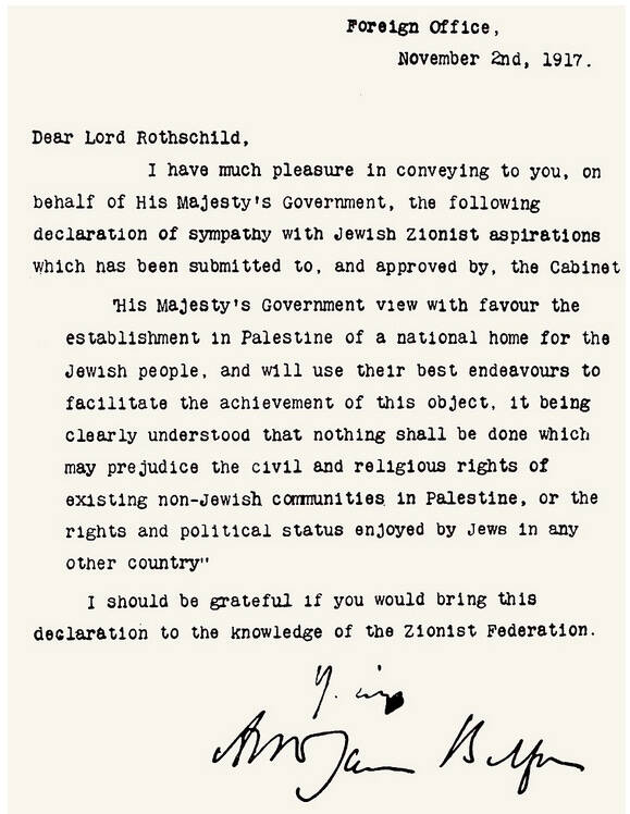 Kasnije te godine, 02. studenog 1917. godine, Arthur Balfour, britanski ministar vanjskih poslova, poslao je pismo lordu Rothschildu, vođi britanske židovske zajednice, da bi ovaj uputio pismo Cionističkoj federaciji Velike Britanije i Irske. Pismom je najvljena britanska podrška uspostavljanju "nacionalnog doma za židovski narod“ u Palestini, koja nije bila pod britanskom vlašću, budući da je bila dijelom Osmanskog Carstva: