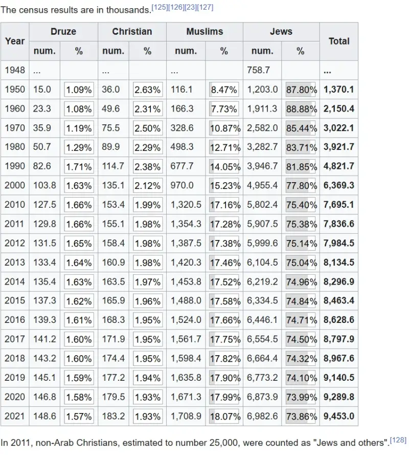 Ukratko, kršćanstvo bilježi rast u većini zemalja Bliskog istoka, ali se smanjuje kod ključnih izraelskih saveznika: Jordanu, Siriji i Iraku. U Palestini je smanjenje kršćana izravna posljedica izraelske politike, a Turska je povijesno čistila kršćane iz zemlje, ali trenutno se čini kao da postoji rast stanovništva koje se identificira kao kršćani. Podaci za Libanon također su nejasni, a Cipar je isključen. Evo cijele tablice: