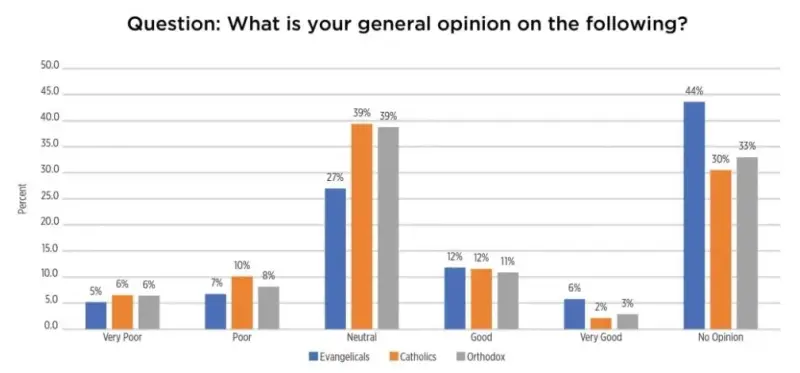 Slično tome, mišljenja o kršćanima su pretežno pozitivna u svim muslimanskim zemljama, sa izuzetkom Turske i Pakistana. Istovremeno, nisu toliko niti pozitivna u Izraelu. Među Židovima su 49-49, dok među izraelskim Arapima 73% kršćane gleda pozitivno, a samo 20% negativno.