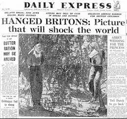 U srpnju 1947. godine je židovska teroristička skupina Irgun otela je i linčovala dva britanska vojnika (poznato kao "Afera narednika"). Tijela narednika Clifforda Martina i Mervyna Paicea bila su minirana, koje su trebale eksplodirati kada bi im se tijela počela skidati sa drveta. Prema izvješću o povijesti palestinske policije (link na stranicu priložen gore u tekstu) - ovaj skandal je izazvao izbijanje antisemitizma u Britaniji.