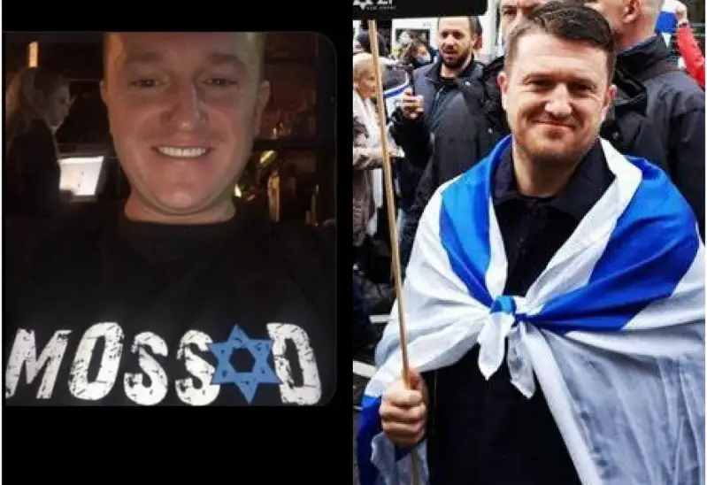 Ovdje je Tommy Robinson koji ponosno nosi majicu sa natpisom Mossad (uz gratis: Tommy i izraelska zastava):