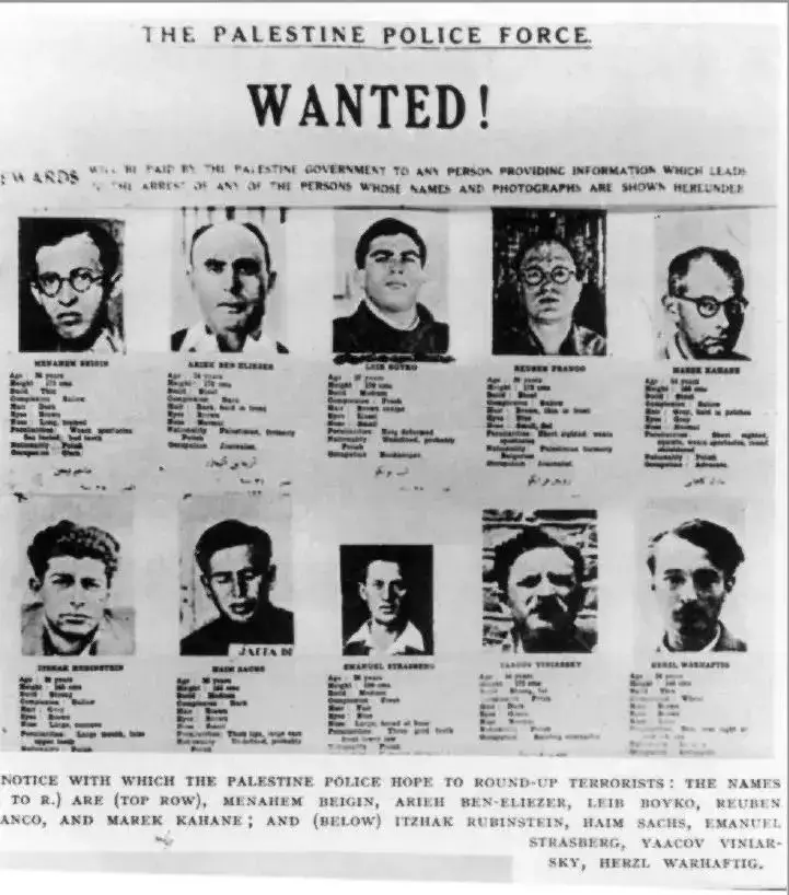Popis cionističkih terorista, koje je tražila britansko-palestinska policija, uključuje i ime budućeg izraelskog premijera, Menachima Begina.