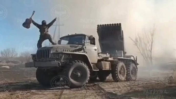 Wagner glazbenik sa gitarom stoji na haubi GRAD bacača.