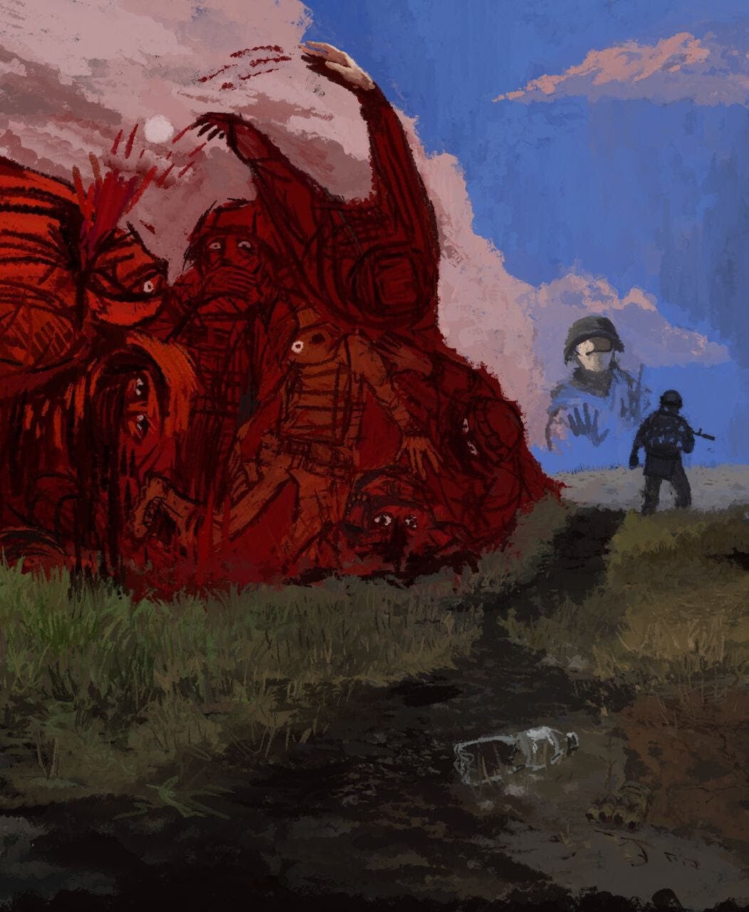 "Vani je prašnjavo i sunčano ljetno poslijepodne. Naprijed, nasred makadamske ceste, leži mrtvi ukrajinski vojnik. Odvlačimo ga sa ceste i uzimamo sve što nam je potrebno, kao i uvijek, nakon čega ga ostavljamo u dostojanstvenoj samoći. Prođe dan, dva, tri, pa i naši kamioni za opskrbu počinju često koristiti ovu cestu. Ubrzo je ukrajinski vojnik već utisnut u prašnjavi šljunak, nakon što su ga nekoliko puta slučajno pregazili prolazijući Ural kamioni. Prođe nekoliko tjedana, pa mjesec i od njega gotovo ništa ne ostane. Teška oklopna vozila počinju koristiti cestu i postupno se njegovi ostaci temeljito samelju u zemlju, postajući neizvadiv dio tla. Nakon još mjesec dana i apsolutno svi zaboravljaju da je na tom komadu zemlje nekada ležao leš čovjeka. Dok ga zemlja probavlja, njegova majka će dobiti kratku obavijest, "Vaš sin je nestao u akciji". Tisuće ovih slučajeva, nestalih u akciji, leže uokolo čekajući da zemlja dovrši rastvaranje njihovih osakaćenih ostataka u sebi. U međuvremenu, njihove obitelji sa suznim očima i dalje će gajiti nadu kako će se jednog dana njihovi vječno mladi sinovi i neostarjeli očevi vratiti kući."