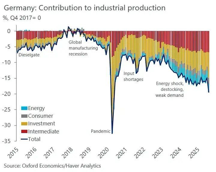 Njemačko gospodarstvo je u recesiji. Proizvodnja je urušila, posebno u ključnom automobilskom sektoru, koji je od 2022. godine izgubio stotine tisuća radnih mjesta. No, još 2018. godine je ovaj sektor izgubio nevjerojatnu trećinu svog obujma proizvodnje. U kolovozu je zabilježen najveći pad industrijske proizvodnje u više od tri godine, više od četiri puta veći od pada koji su analitičari očekivali. Ključni strojarski sektor je pao za 22% u odnosu na razdoblje prije pandemije i samo ove godine očekuje se pad od 5,6%. Posljednjih mjeseci dogodio se ogromni pad u farmaceutskoj, elektroničkoj, energetskoj, građevinskoj i ugostiteljskoj industriji.