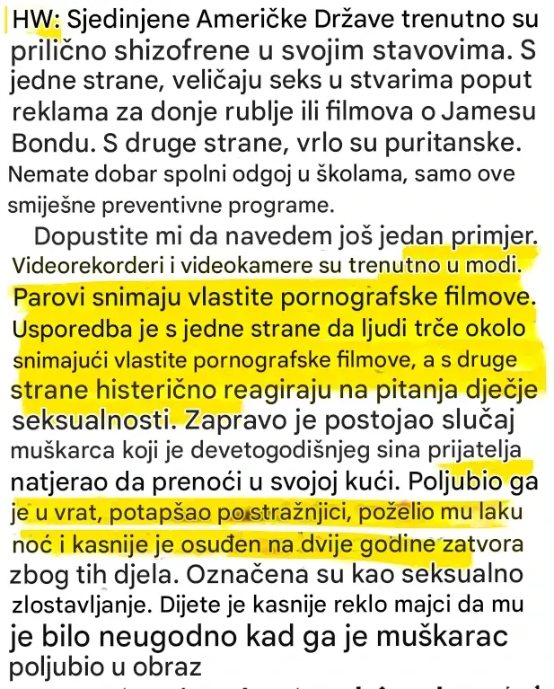 "Incest je dobar, jer su visoko seksualizirana djeca prokreativnija, a to je dobro za čovječanstvo. Seksualizacija djece može imati prokreativne svrhe, jer je za seksualizirano dijete vjerojatnije da će se razmnožavati u ranijoj dobi."