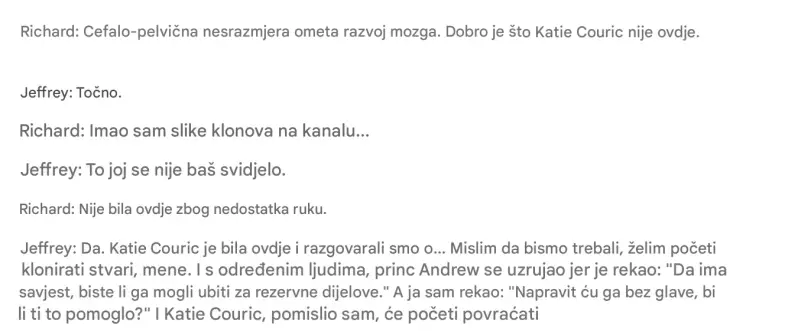 Tada je Epstein izričito rekao: "Mislim da bi trebali, želim početi klonirati stvari, mene." Princ Andrew pita može li se klon sa sviješću ubiti za rezervne dijelove. Epsteinov odgovor: "Napraviti ću ga bez glave, bi li se zbog toga osjećao bolje?" Couric je, prema transkriptu, gotovo povratila. Međutim, nikada to nije prijavila. Kao i većina ove priče, bilo je iza vela.