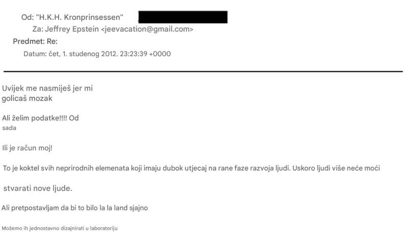U zasebnoj e-poruci, norveška krunska princeza je napisala Epsteinu, u studenom 2012. godine (Ref: EFTA00947189): "Uskoro ljudi više neće moći stvarati nove ljude... Možemo ih jednostavno dizajnirati u laboratoriju."