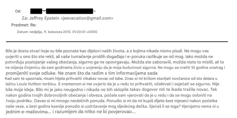 U drugoj e-poruci (Ref: EFTA00678699), žena piše Epsteinu: "Dao si mnogo neobičnih ponuda. Ponudio si mi da kupiš bebu šest mjeseci nakon početka naše veze." Što? Ne posvojiti. Kupiti.