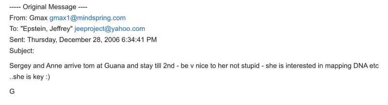U prosincu 2006. godine je Ghislaine Maxwell poslala e-poštu Epsteinu o Sergeyu Brinu i Anne Wojcicki: "Budi vrlo ljubazan prema njoj, a ne glup - zanima je mapiranje DNK-a itd... ona je ključ. G"